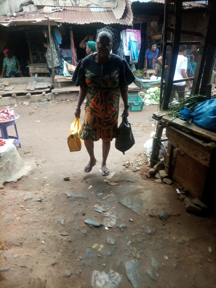 An elderly woman wearing a colorful dress and sandals walks towards the camera, carrying a yellow bag in her left hand and a black bag in her right. She is on a dirt path in a crowded marketplace. Behind her, several stalls are visible, with people selling vegetables and other goods. The ground is uneven and littered with debris. A small table of tomatoes sits to her left. The scene is cluttered, and the light is somewhat dim.