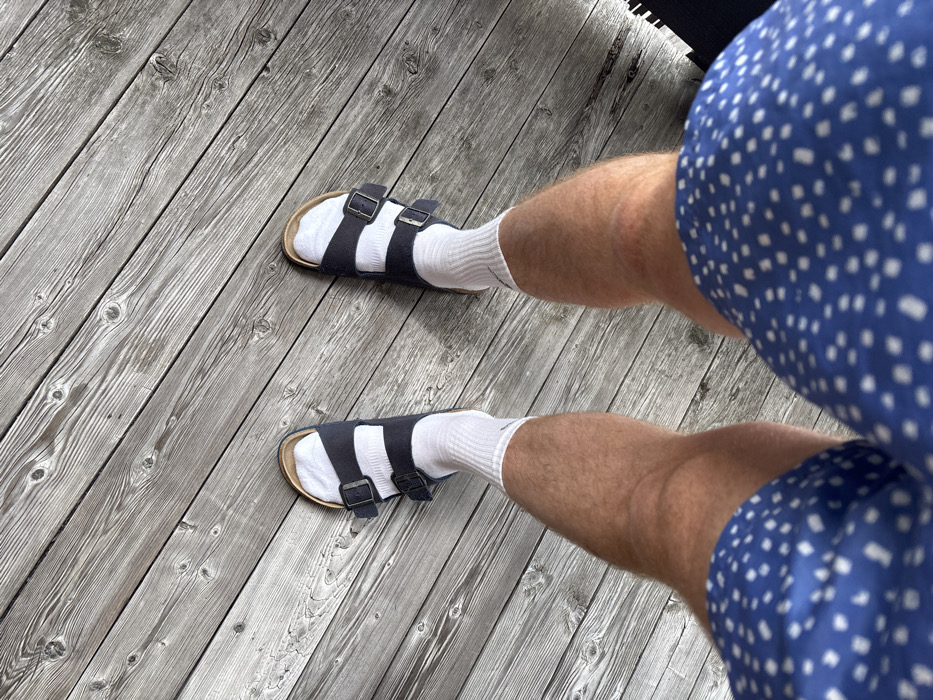 A person stands on a gray wooden deck wearing white socks and black Birkenstock-style sandals