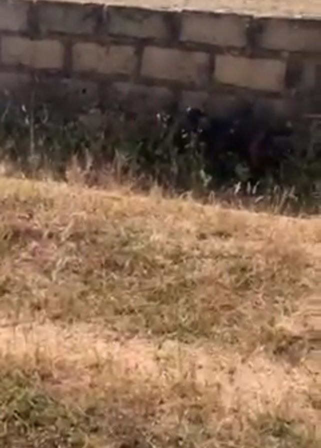 brown and white goat lying down in the grass next to a short brick wall. The grass is dry and yellowish. Behind the wall are two buildings with light brown walls and blue window panes. The sky is bright and clear. The camera is stationary and focused on the goat. There is some indistinct speech in the background.