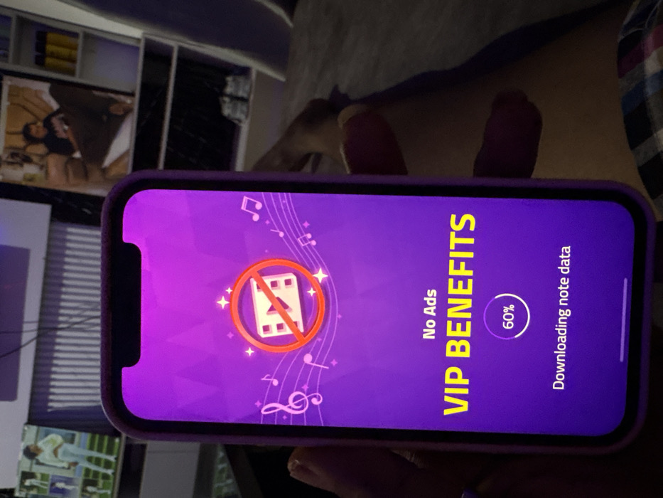 A phone displays a purple screen for a "VIP BENEFITS" subscription. The benefits include "No Ads" and downloading note data, which is 60% complete. A red circle with a line through a film reel icon is also shown. The phone has a purple case and is held in someone's hand. The background includes furniture and a television displaying a light scene.
