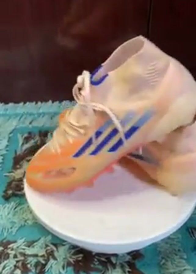 Two soccer shoes are sitting on a white cake stand. The cake stand is placed on a light blue rug with a turquoise, green, and orange pattern. The shoes are peach-colored with three blue stripes on the side. There is a peach and orange pattern near the toe. A brown wooden cabinet is visible in the background. The cake stand is rotating.