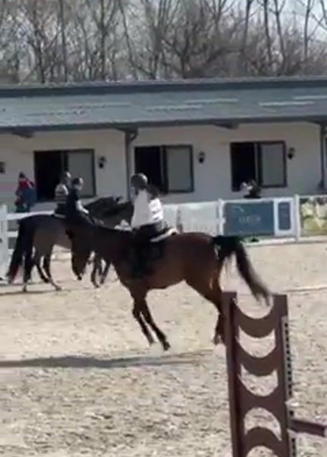horse and rider in an equestrian arena. The rider, wearing a helmet and white jacket, guides a dark-colored horse over a jump. Other riders and horses are visible in the background. The arena has a light-colored, sandy surface. A building with white trim and several windows borders the arena. Trees, without leaves, are visible beyond the building. The sky is light blue.