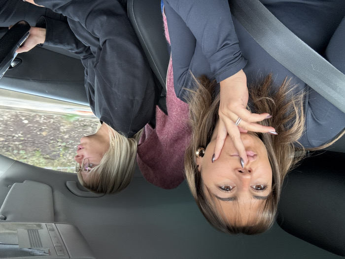 The image captures two adult females inside a moving vehicle, described as being in Aix-en-Provence, France