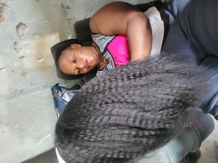An indoor scene in Maiburiji, Nigeria, depicts an adult female seated in a dark chair, observed from a slightly elevated, angled perspective