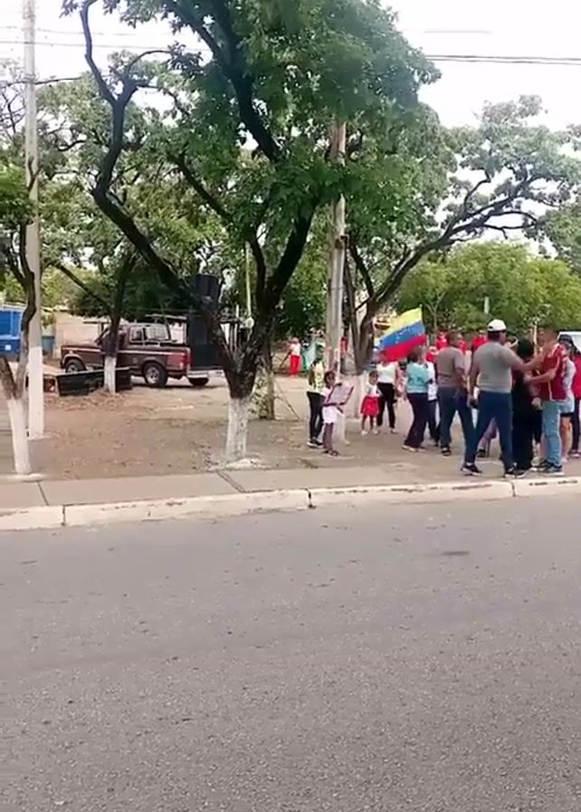 The camera stands in front of a street overlooking a park. In the background, a group of people is standing around. One person is holding up a Venezuela flag. There is a small child in front of the crowd also holding a flag. Behind the crowd, there is a brown truck parked behind a tree. Large speakers sit on the bed of the truck. The sound of a man singing can be heard from the speakers. There are trees on either side of the park.