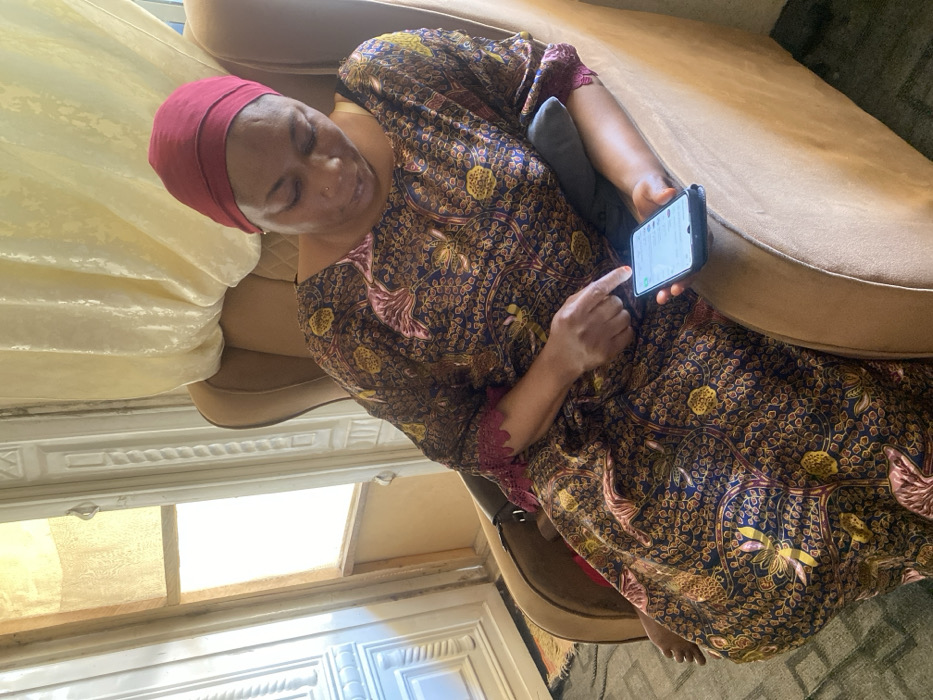An adult female, wearing a maroon head covering and a patterned dark blue and gold dress with maroon lace trim, is seated in a beige upholstered wingback armchair. Her gaze is directed downwards, focused on a black smartphone she holds in her left hand, while her right index finger interacts with its screen, which displays a messaging application interface. A dark gray cushion is positioned between her right arm and torso. In the background to her left, a light-colored ornate window or door frame allows bright daylight into the room, and yellowish-cream textured curtains hang above her right shoulder. A segment of a patterned rug is visible on the floor in the lower left. This scene takes place indoors in the city of Hotoro South, Nigeria.