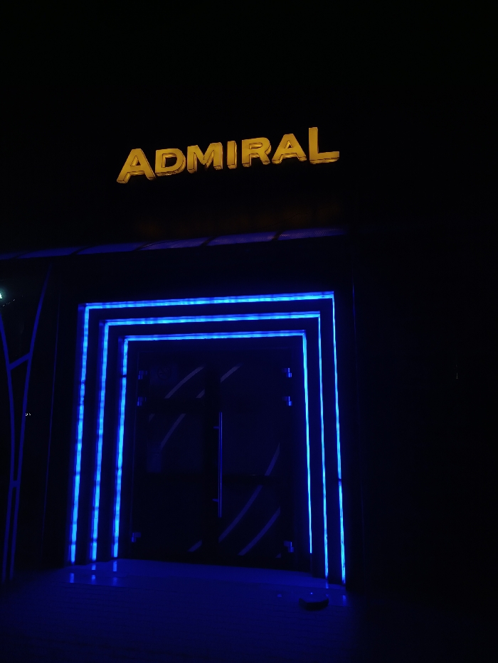 The image displays the illuminated exterior entrance of a building identified as "ADMIRAL" at night in Pleven, Bulgaria