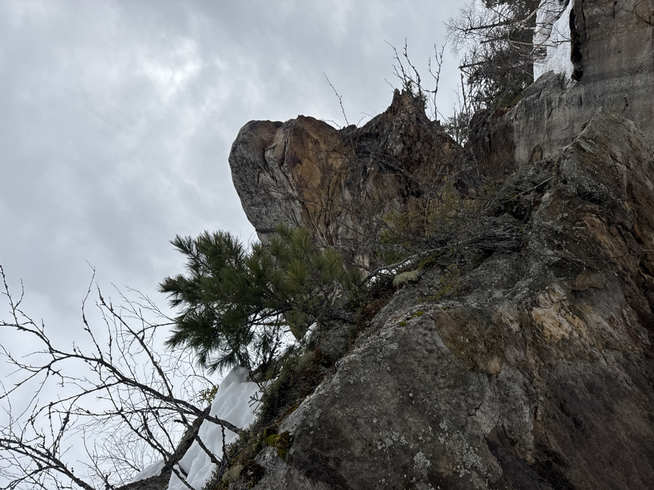 The image displays a rugged natural rock formation within the city of Shumikhinskii, Russia, under an overcast, grey sky. The dominant feature is a large, multi-toned rock face exhibiting shades of grey, brown, and tan, with visible striations and erosion patterns. On the upper right, a distinct rock outcrop protrudes, presenting a profile resembling a human or animal head. A small, healthy coniferous tree with green needles is centrally positioned, growing from a crevice in the rock. Numerous bare, skeletal branches of deciduous trees are scattered throughout the scene, particularly prominent in the upper left and mid-right. Patches of white snow are visible on ledges and ground surfaces, notably in the upper left and lower right sections of the frame. Moss and lichen patches adhere to the rock surfaces. No individuals, man-made objects, or specific actions are depicted.