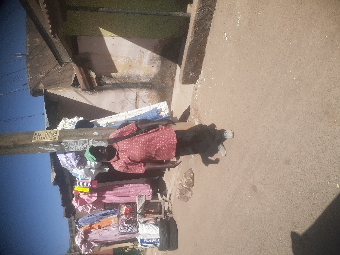This image captures a bright daylight street scene in Jos, Nigeria, featuring a man standing near a roadside stall. The environment consists of a light brown, possibly unpaved, road surface under a clear blue sky, with strong shadows indicating direct sunlight. **People:** An adult male, appearing to be of dark complexion, stands in the mid-foreground, slightly to the left of the center. He is wearing a green baseball cap, a patterned red short-sleeved collared shirt, dark trousers, and light-colored sneakers. A dark shoulder bag is slung over his left shoulder. He is looking generally towards the viewer. **Objects and Structures:** A utility pole, possibly concrete, stands prominently in the mid-ground, slightly left of center. Multiple faded flyers and papers are taped haphazardly to its surface. To the left of the pole, a makeshift outdoor clothing stall is visible, displaying various garments including dresses and shirts in colors such as pink, white, blue, orange, red, and yellow, hanging from racks or lines. On the ground near the stall, there are several bags, including a white one partially labeled "FLAWLE," and a black car tire. A small stool or table holds a patterned bag. Behind the utility pole and extending to the right, several weathered buildings are present, characterized by corrugated metal roofs and discolored walls that appear to be painted in pale pink and light yellow tones, showing signs of wear and dirt. A low, dark-colored concrete curb or wall is visible along the far right edge of the foreground. Shadows are cast from the man, the pole, and other unseen elements onto the ground and building walls.