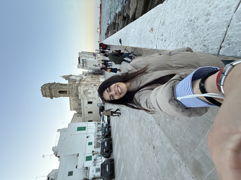 An outdoor scene in the city of Monopoli, Italy, depicts a paved plaza adjacent to a stone seawall. In the immediate foreground, a female with long dark hair, wearing a beige puffer coat over a blue and white striped shirt, is smiling directly at the camera. Her left arm is extended forward, revealing a red bracelet and a black hair tie on her wrist. To her left, a row of white stucco buildings with green window shutters lines a street, where multiple cars (including a black SUV and various hatchbacks) are parked. In the mid-ground, the Chiesa di San Leonardo, a light-colored stone church with a prominent bell tower and visibly aged facade, stands behind the parked vehicles. To the female's right, a light-colored stone seawall separates the plaza from the sea. Several individuals are present: a man walks across the plaza towards the left, while a group of adults and a child on a small scooter or bike walk along the seawall and steps. The sea, characterized by choppy, dark blue water, is visible to the far right, with a breakwater of large stones. A large red cargo ship is discernible on the distant horizon. The sky is clear and light blue, suggesting daytime conditions.