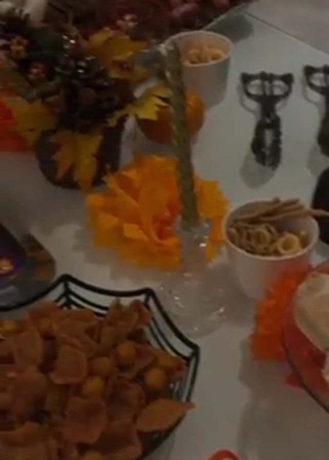 A table is set with an assortment of Halloween-themed snacks and decorations