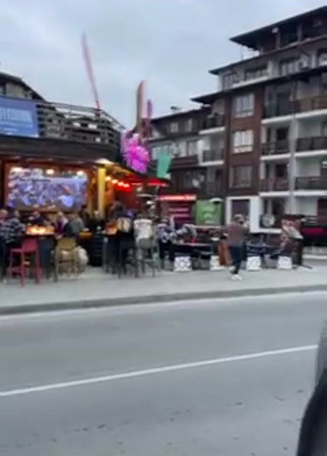 street scene across from an outdoor bar. People are sitting at tables and stools, watching a large TV screen. Flags are flying above the bar. A man walks by the camera. A multi-story building is visible next to the bar. The sky is overcast.