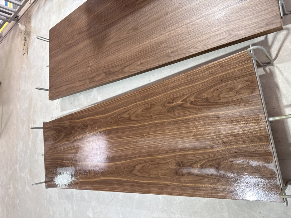 The scene, located in Al Bahraoyine, Morocco, displays two large, rectangular wooden panels resting horizontally on a light gray concrete floor within an indoor industrial or workshop setting. The left panel features a highly reflective, wet-appearing clear coat, with a small pile of white, granular material situated on its upper-left surface. This panel is supported by four metallic, U-shaped brackets, two visible at each end. The right panel, positioned parallel to the left, exhibits a drier, semi-gloss or matte finish. It is also supported by similar metallic brackets, with two visible at its far end. Both panels display prominent dark brown wood grain. The background reveals indistinct industrial structures, including a metal railing, and sparse debris on the concrete floor.
