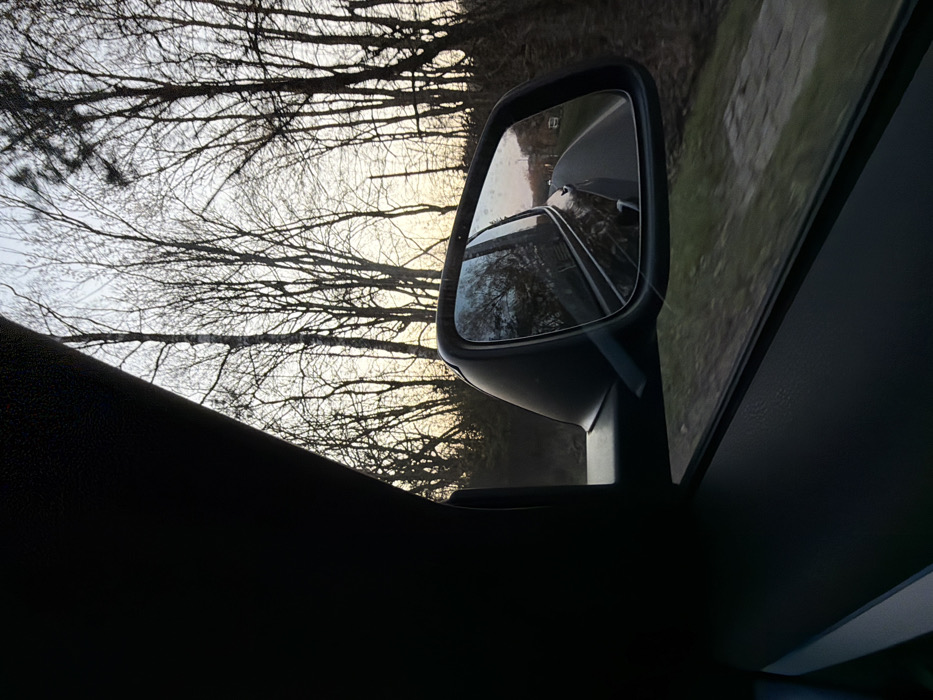 The image presents a view from the interior of a moving vehicle, looking outward through the front passenger-side window. The dominant foreground consists of the vehicle's dark-colored A-pillar on the left and a portion of the door panel below. A black exterior side mirror is prominently positioned in the mid-ground, reflecting the environment behind and to the immediate side of the vehicle. Through the window, an exterior landscape is visible. The sky, characteristic of late afternoon or early evening, displays a gradient from light blue at the top to a pale yellow-orange near the horizon. Numerous tall, slender deciduous trees, devoid of leaves, line the right side of the road, their dark branches forming intricate patterns against the illuminated sky. The side mirror's reflection clearly shows a paved road, likely asphalt, curving gently to the right. Patches of green vegetation are visible along the roadside. A faint reflection of another vehicle can be observed in the distance on the road, traveling in the same direction. A white, circular road sign, possibly indicating a speed limit, is partially visible on the right side of the reflected road. No human figures are discernible in the scene. The scene is located in Niederanven, Luxembourg.
