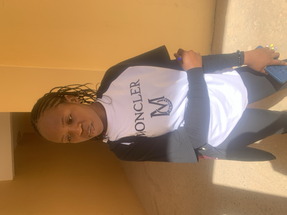 A woman with braided hair stands angled slightly, wearing a white t-shirt with a large "Moncler" logo and long black sleeves underneath. She has a phone in her hand and wears bracelets and rings. She is standing outside against a yellow wall with a light-colored concrete floor. The image is rotated, so she appears sideways. The lighting suggests a sunny day.