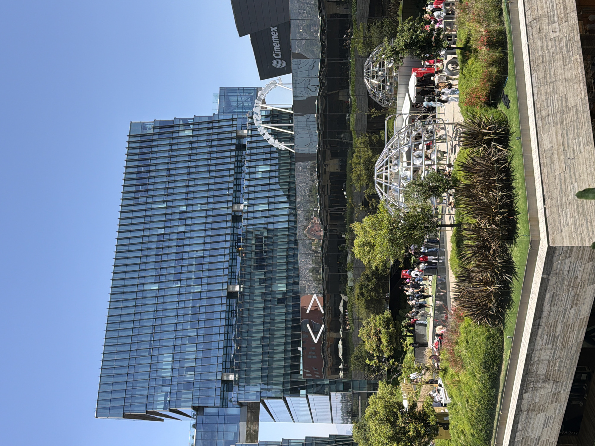 This photograph captures a daytime view in Mexico City, Mexico, showcasing a blend of modern architecture and urban landscaping. In the foreground, there's a verdant green area, possibly a rooftop garden or elevated park, where people are gathered. Two metal globe-like structures with reflective interiors are positioned within this green space. Behind the park area is a towering glass skyscraper. The reflective facade of the building mirrors the surrounding environment, including parts of the city, and a Cinépolis movie theatre can be identified by the signage on the building. The scene is set against a clear blue sky, emphasizing the height and scale of the buildings. People in the image seem to be relaxing, enjoying the greenery, and the overall impression is one of urban leisure and architectural design.