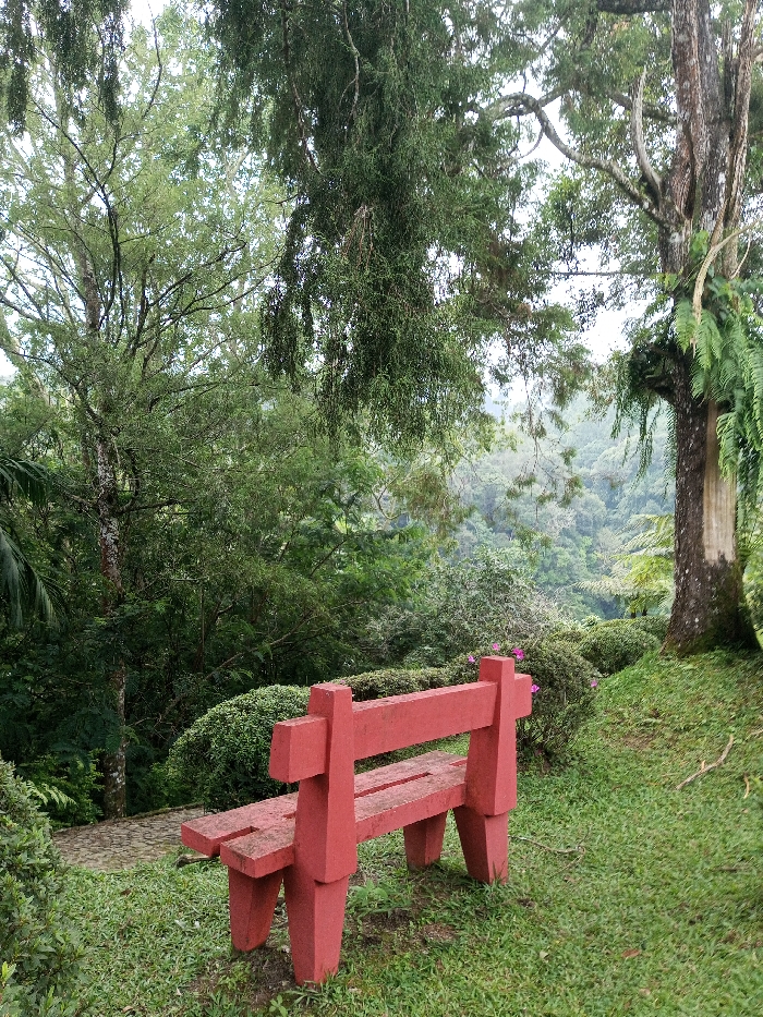 The scene, located in New Serchhip, India, depicts an unoccupied red-orange concrete bench situated on a grassy incline in the foreground, slightly left of center. The bench features a robust, angular design with a solid backrest and two parallel seat planks, showing signs of weathering. To the left and slightly behind the bench, a portion of a descending stone-paved path is visible. Immediately behind the bench, manicured green shrubs are present, with sparse pink flowers visible within the foliage on the right side. The ground surrounding the bench is covered in lush green grass, sloping gently upwards towards the right. Large trees dominate the upper and peripheral areas of the image, including a prominent tree trunk with attached ferns on the far right and a lighter-barked tree on the far left. Dense, dark green foliage hangs from the upper canopy. The midground and background reveal a verdant, densely forested valley and distant hills, partially obscured by atmospheric haze or mist. The sky is overcast. No individuals or active subjects are present in the image.