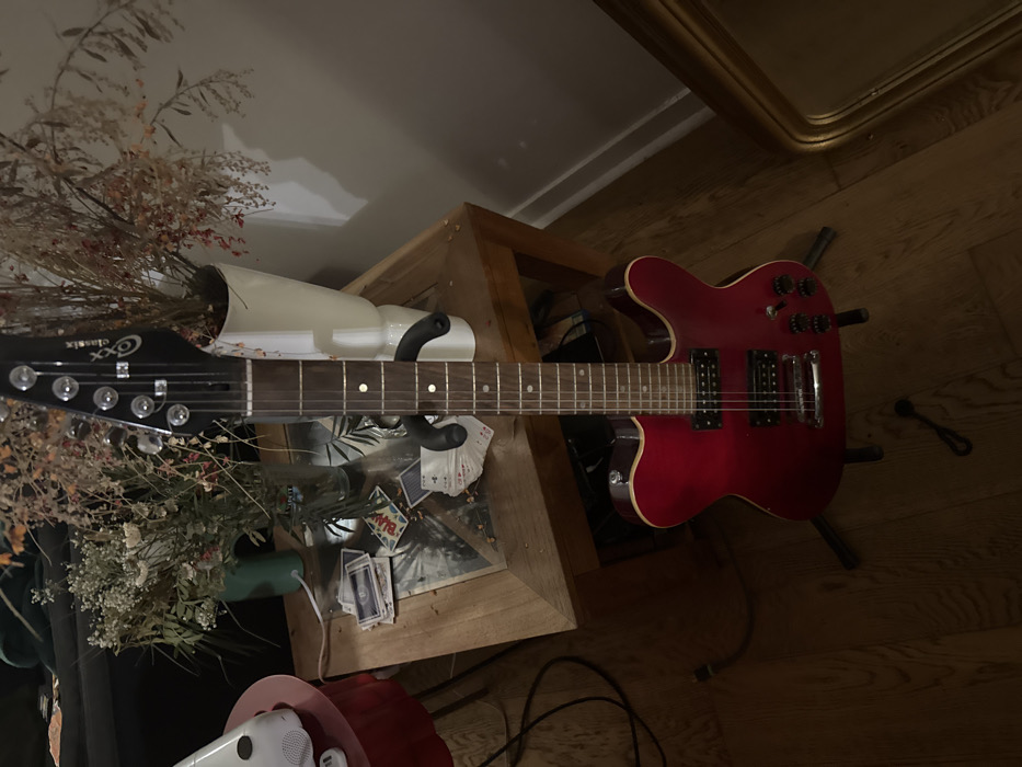 A red electric guitar sits on a stand against a wooden floor and table. The guitar's headstock, labeled "Cxx Classix," extends towards a dried floral arrangement in a white vase. Playing cards are scattered beneath the guitar's neck on the table. The guitar body rests on the wooden floor next to the table, while a gold-framed object is partially visible in the upper right corner. A red cylinder and a white electronic device are present in the lower-left corner.