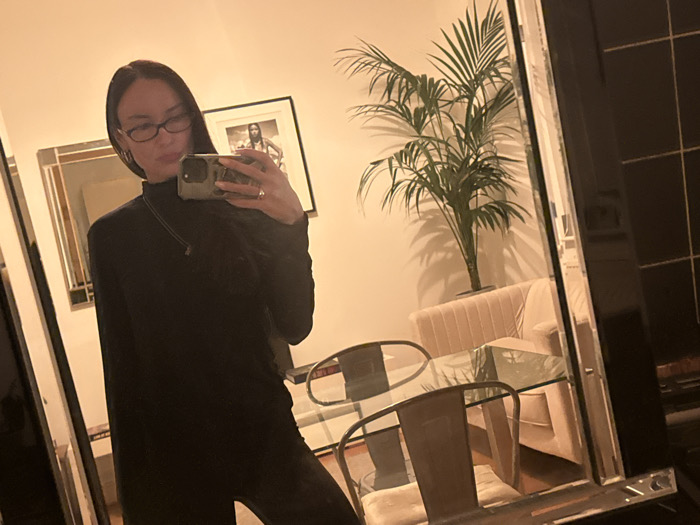 A woman in black turtleneck and pants, wearing glasses, takes a selfie in a mirror