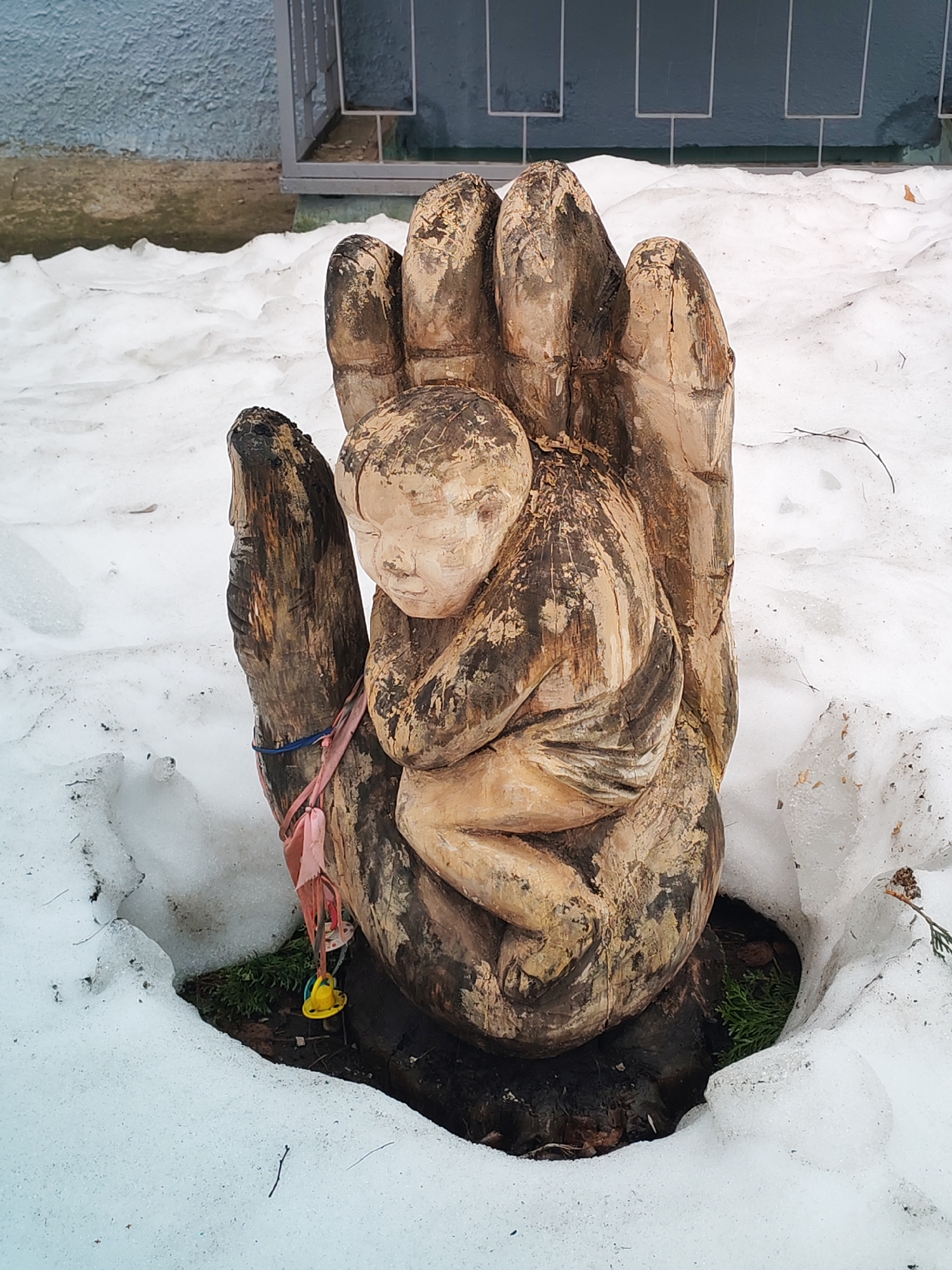 - "The image depicts a wooden sculpture of a hand cradling a baby, located outdoors in what appears to be winter conditions with snow on the ground" by FM-N5WuU2, licensed under CC BY 4.0