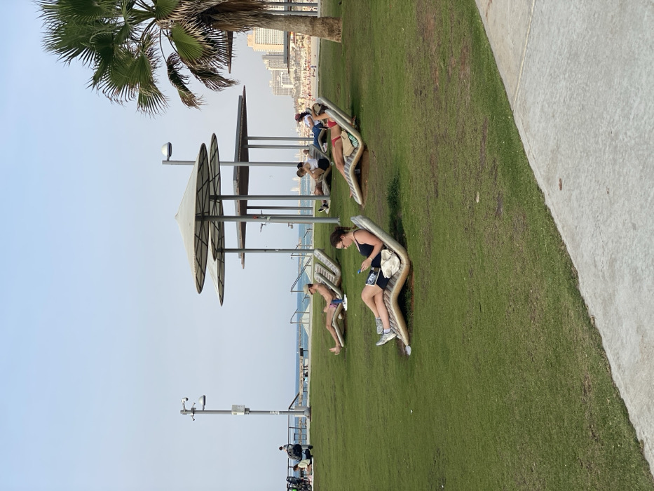 The scene depicts a vibrant beachfront park area in Tel Aviv, Israel, likely along the promenade
