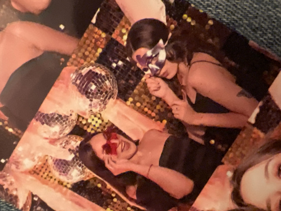 Two women pose on a gold and black sequined backdrop. One woman wears a decorative mask, a black dress with spaghetti straps, and a ring on her left hand. The other wears red heart-shaped sunglasses and a strapless black dress. A disco ball sits near the woman in sunglasses. Images of other people surround them.
