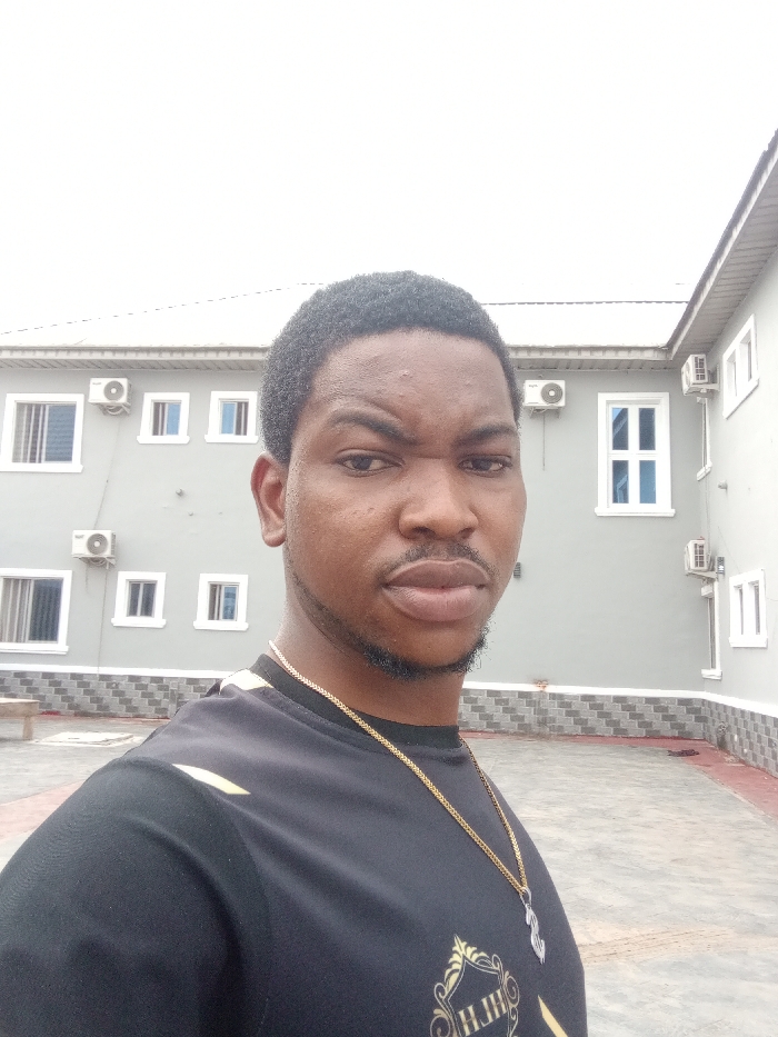 An adult male subject, of African descent, is depicted from the waist up, facing forward with a direct gaze towards the camera and a slight furrowing of the brow. He has short, dark, curly hair, a mustache, and a short beard. He is wearing a black short-sleeved t-shirt featuring a gold-colored emblem with stylized text on the chest. A gold-colored chain necklace with a metallic, elongated, curved pendant is visible around his neck. The background consists of a light grey multi-story building with a light-colored sloped roof. The building facade features multiple white-framed windows of varying sizes and several wall-mounted external air conditioning units. The ground in the foreground and midground is a paved area composed of interlocking grey and reddish-brown blocks. The sky is overcast and light-toned. The scene is situated in an outdoor paved area in Igrwre-Ovie, Nigeria.