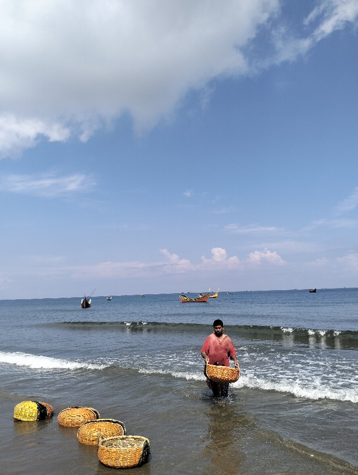 A man in a red shirt carries a woven basket while wading into the ocean. Four similar baskets rest on the shore. Gentle waves lap at the beach. Several small boats are scattered across the water in the distance. The sky is partly cloudy with a light blue hue.
