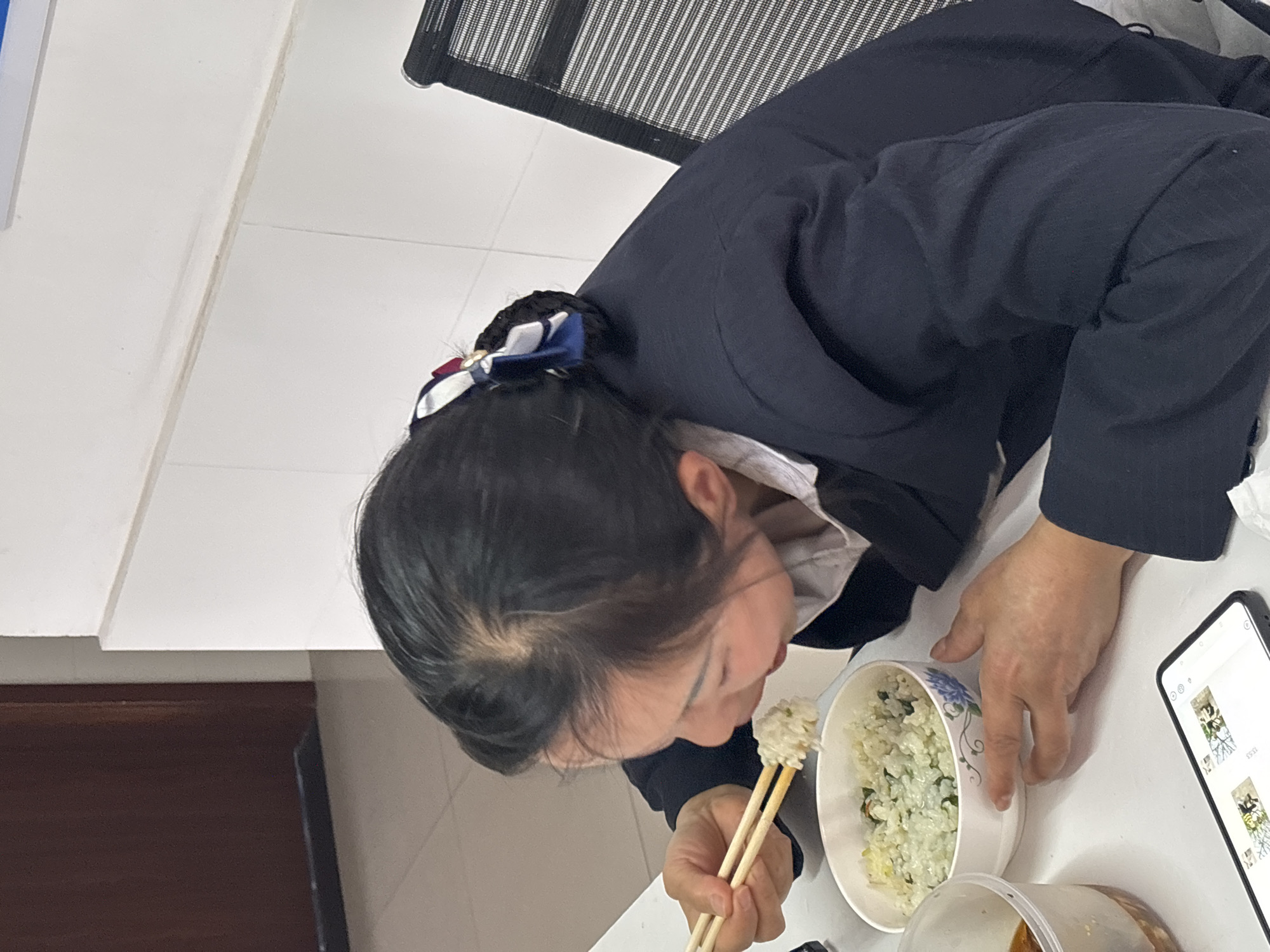 A high-angle shot shows a woman with black hair, wearing a navy suit jacket and white undershirt, eating from a white bowl with blue floral designs using chopsticks. The bowl contains rice mixed with green vegetables. There is another container with an orange lid next to the bowl. A mobile phone is situated on the table surface to the right of the bowl. The location is Jiangjin, China.