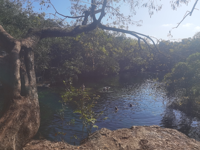 freshwater cenote, a natural sinkhole filled with water, in a wooded area. It is located in San José, Mexico, at coordinates 20.492 latitude, -87.258 longitude. The cenote is filled with clear blue water and surrounded by lush vegetation. Several people are swimming in the cenote, some of them are diving. A large tree with thick branches and a rough trunk is in the foreground. The tree is leaning towards the cenote, its branches reaching out over the water. The ground around the cenote is covered in rocks and dirt. The sun is shining brightly, casting shadows on the water and surrounding vegetation. The image appears to be taken on a clear day.