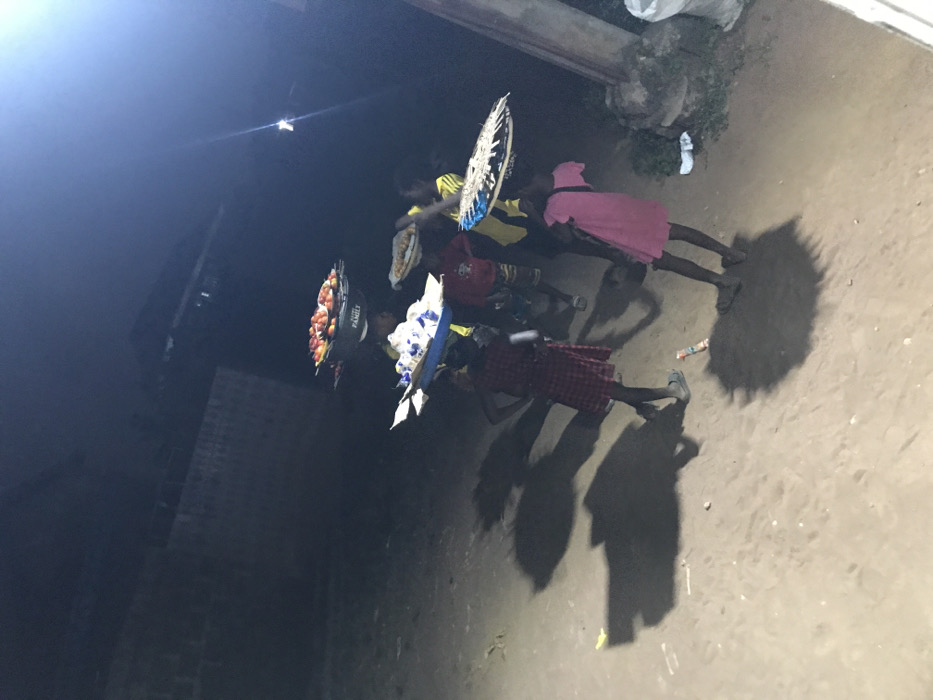 Four children stand on a concrete surface. One carries a tray of fruit on their head, labeled "Family." Another balances a white circular object, and a third wears a pink dress. The fourth child wears a plaid dress. Shadows of the children are cast on the ground. The scene is illuminated by an unseen light source, creating stark contrasts. A wall is visible in the background.