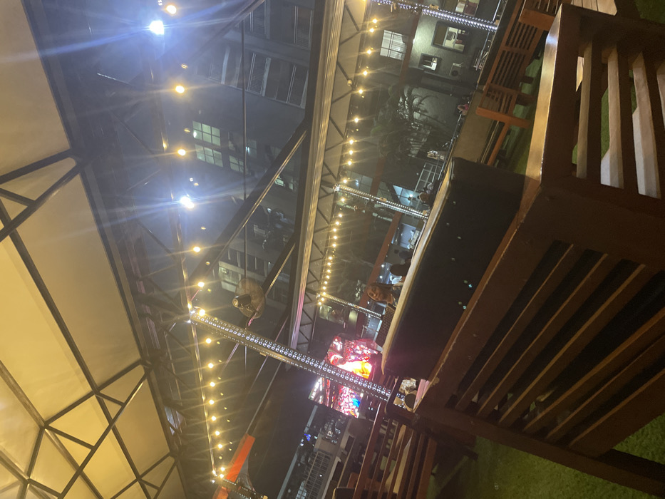 An outdoor seating area at night, illuminated by string lights, features wooden benches and tables. A large screen displays bright colors. Buildings are visible in the background. A decorative skull hangs from the overhead structure. The lighting creates a warm ambiance. The viewpoint is slightly angled upwards, emphasizing the ceiling and string lights.