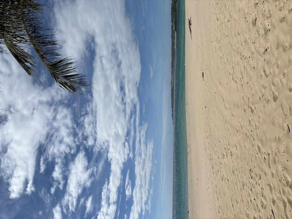 This image captures a serene coastal landscape on a beach in Hengchun, Taiwan. The upper portion of the frame features a bright blue sky filled with scattered white cumulus and wispy cirrus clouds. From the upper right corner, several dark green palm fronds extend diagonally downwards into the frame. The mid-ground is occupied by the ocean, displaying a turquoise-blue hue near the shore, indicative of shallow water, which transitions to a deeper blue further out. Small ripples and minor wave activity are visible on the water's surface. A distant, low-lying landmass, appearing as a dark green, undulating coastline or island, stretches across the horizon in the background, primarily on the right side. The foreground and lower half of the image consist of an expansive area of light golden-brown sand. The sand surface is textured with numerous footprints and scattered natural debris, such as small sticks and leaves. A single, elongated piece of light-colored driftwood lies horizontally on the sand in the mid-right foreground, casting a subtle shadow. No human subjects, animals, or explicit actions are present in the scene.