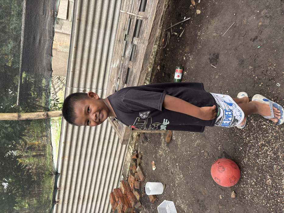 - "A smiling young boy in a black t-shirt and patterned shorts stands on a dirt ground surface near a corrugated metal structure and bamboo" by FM-pZJkE3, licensed under CC BY 4.0