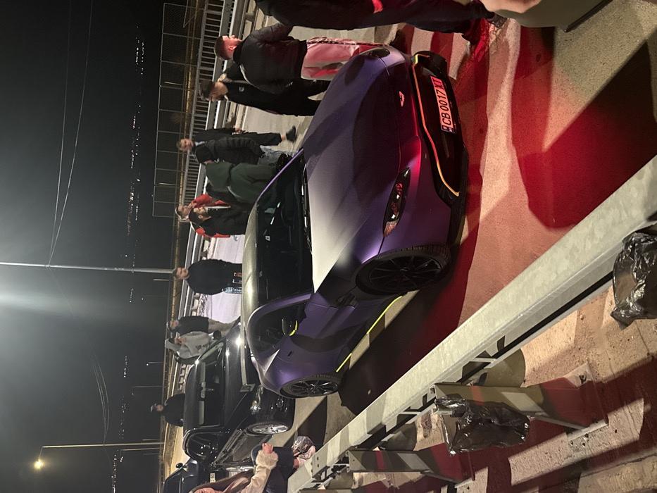 The image captures a nighttime gathering on an elevated roadway, likely a bridge or overpass, in Sofia, Bulgaria. The primary subject is a matte purple Aston Martin Vantage coupe (model year 2018 onwards) parked diagonally on the right side of the road, featuring black wheels and yellow accents on the side skirts and front splitter. Its Bulgarian license plate, "CB 0017 XT," indicating Sofia registration, is prominently displayed. Behind the Aston Martin, a black Mercedes-Benz sedan, possibly a C-Class or E-Class, is parked, appearing modified with aftermarket wheels. Approximately 15-20 individuals, predominantly males, are present. They are dressed casually in dark clothing, including hoodies and jackets, and are standing in small groups around the vehicles, engaged in conversation. One woman is visible on the far left, seated on a metal guardrail, wearing a light-colored jacket and dark pants, observing the scene. The environment is dimly lit by overhead streetlights, with a bright light source in the upper center. Red light is cast onto the road surface from the front of the Aston Martin, potentially from underglow or brake lights. In the distant background, across a dark expanse, numerous scattered lights indicate a distant urban or suburban area. Two black plastic bags are tied to the metal guardrail on the left side of the frame. The road surface is dark asphalt or concrete. The gathering appears to be a stationary social event for car enthusiasts.