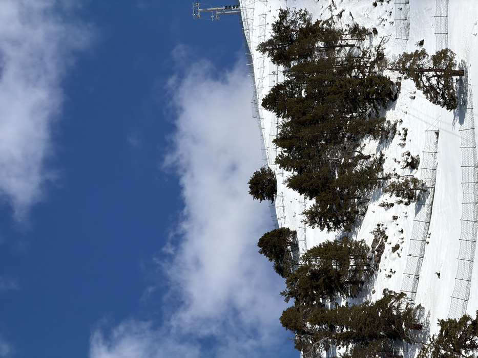 The image displays a snow-covered mountain slope in Lunnaya Polyana, Russia, beneath a clear blue sky partially obscured by white cumulus clouds. The terrain is steep and covered extensively with white snow. Numerous dark green coniferous trees, ranging from small saplings to mature specimens, are scattered across the hillside. Multiple horizontal lines of dark mesh fencing, consistent with snow barriers or avalanche nets, are installed across the slope at varying elevations. In the upper right portion, a metallic structural component, indicative of a ski lift tower, is visible. No individuals or active subjects are present in the scene.