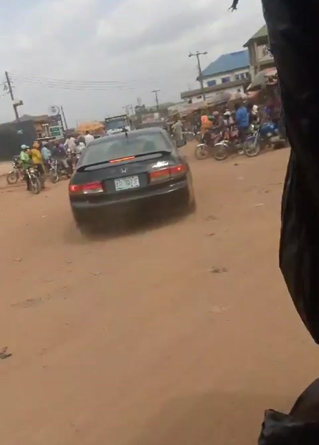 street scene in what appears to be a town in Nigeria. The road is unpaved and dusty. Several motorcycles are visible, many with riders on them. There is a yellow van, and a dark-colored car is briefly seen at the beginning. Buildings are visible on either side of the road. The video is taken from inside a vehicle, presumably a type of motorized tricycle common in the region.