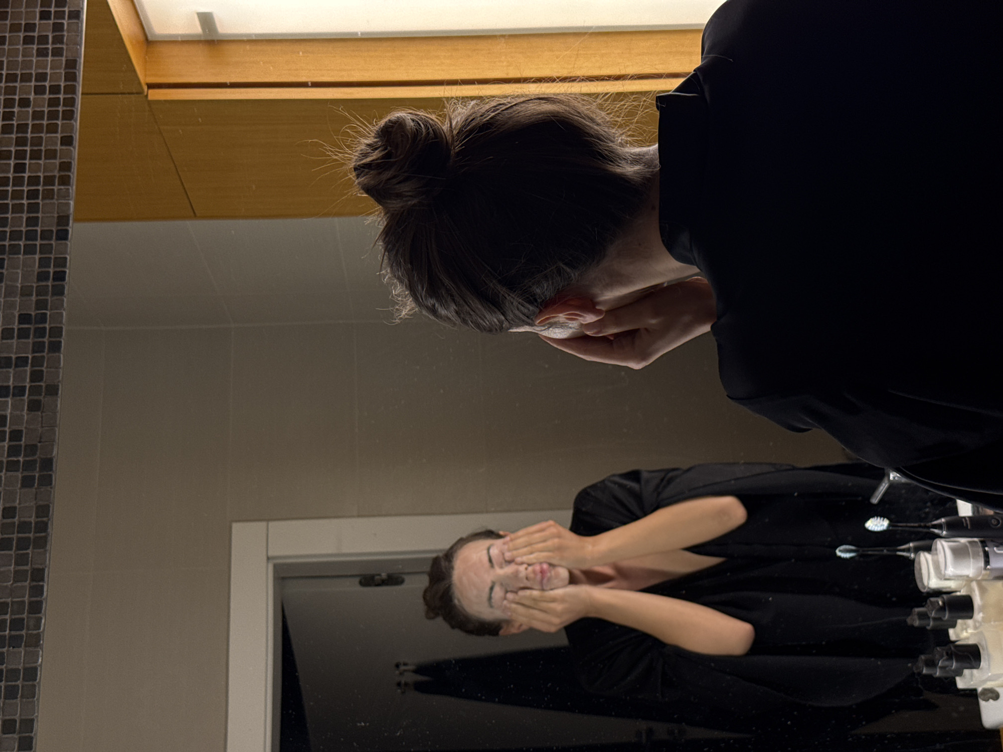 A woman washes her face in a bathroom. The woman is wearing a black robe, and her hair is in a bun. She has white soap on her face, and is rubbing her face with both hands. Her reflection can be seen in the bathroom mirror. The bathroom has gray tiled walls and a wooden cabinet. Several toothbrushes and soap bottles are on the bathroom counter in front of the mirror. The city of Warsaw, Poland is not visible in the image.