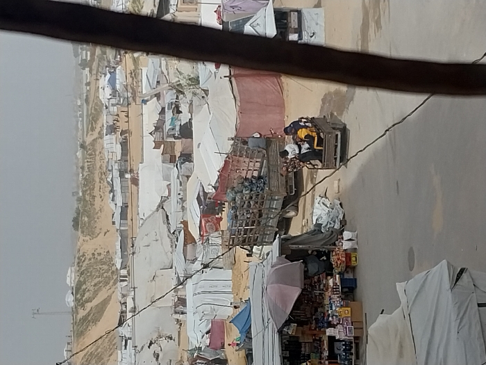 The image depicts an elevated view of a temporary settlement or encampment in Khan Yunis, Palestinian Territory, under a hazy sky