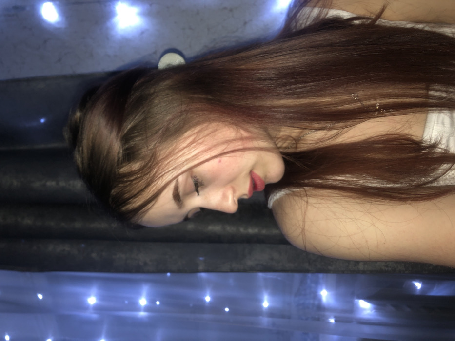 A young woman with auburn hair is reclining. She wears a white top and a delicate necklace. Her eyes are closed, and she has a fair complexion with rosy lips. The surface she's lying on is dark and textured, perhaps a couch. A string of soft, blue-toned lights creates a dreamy atmosphere beneath her.