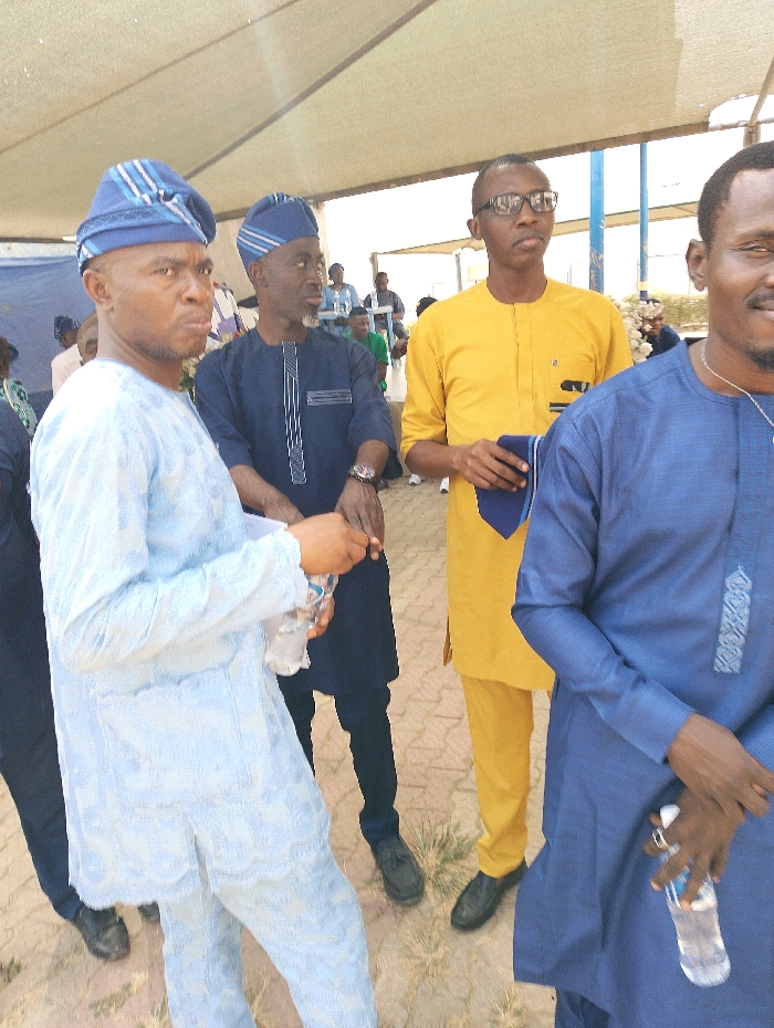 Four men stand in a group, all dressed in traditional African attire. The first man wears a light blue ensemble with a matching cap. Next to him, a man in a navy blue outfit also sports a traditional cap. A third man is dressed in a bright yellow suit, holding a dark blue object in his hand. On the right, the fourth man wears a blue long-sleeved shirt. Each of the men is holding a bottle of water. They appear to be outdoors under some kind of roof or awning.