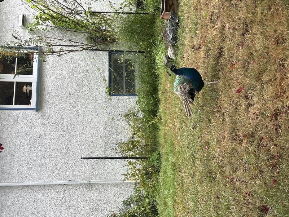 - "A single peafowl stands on a patchy green and brown lawn scattered with red leaves" by FM-p02Wp2, licensed under CC BY 4.0