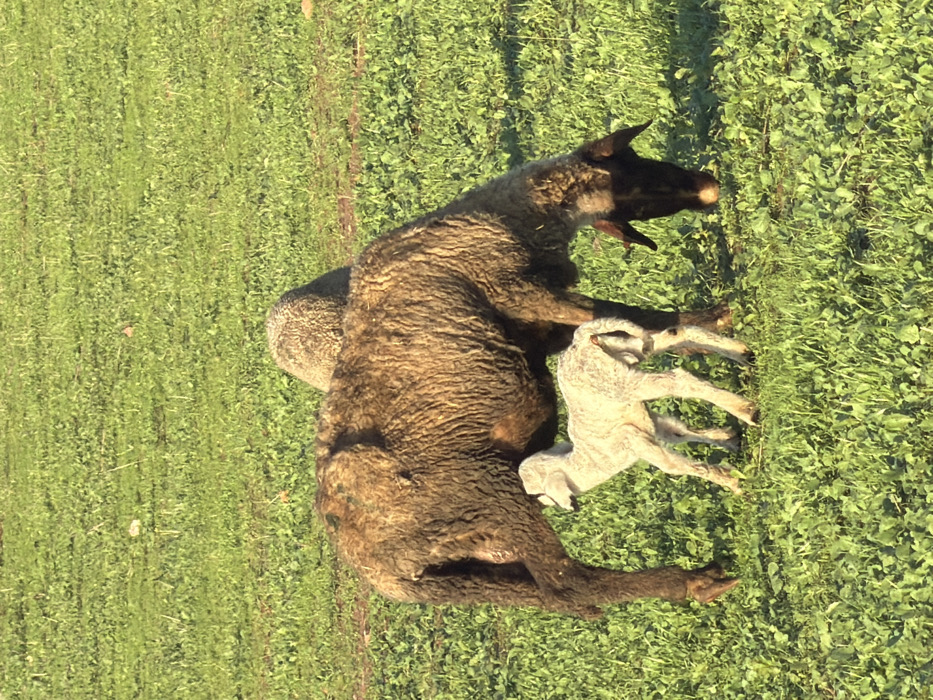 A brown sheep lies on its side in a grassy field. A lamb, lighter in color, rests near the sheep's udder, as if trying to nurse. The sheep has horns and its mouth is open. Both animals are surrounded by green grass. The scene suggests a recent birth or nursing moment in a pasture.