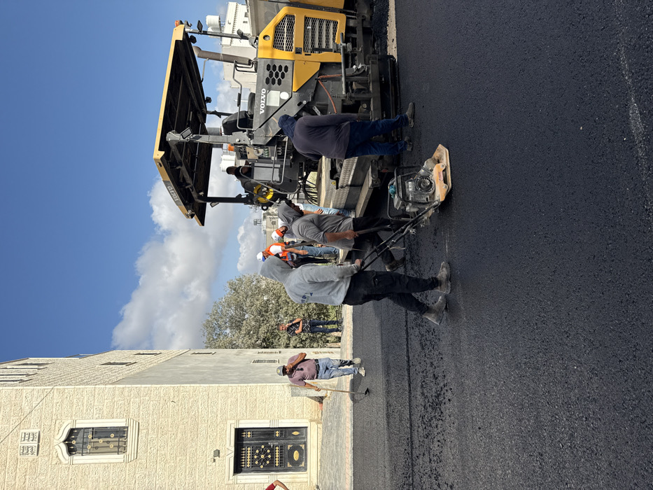 The image depicts a road construction scene in Al-Kum, Palestinian Territory, under a clear blue sky with scattered white clouds
