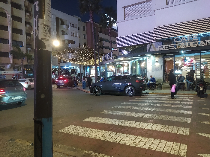 A street scene at night features a cafe/restaurant with outdoor seating occupied by patrons. A gray car is parked near a crosswalk, where a person is walking across. Other cars and people are visible in the background, along with buildings adorned with lights. A street lamp is prominently positioned on the left.