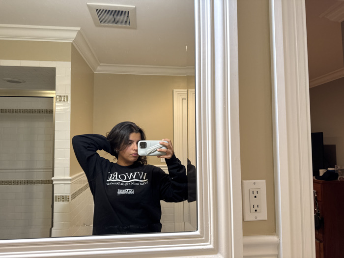 A female individual is depicted in a mirror selfie, captured within a domestic bathroom setting. The subject, seen from the chest up, has dark hair and wears a black long-sleeved shirt featuring white, reversed text that clearly reads "I'M WOR... PrincetoN," indicating an association with Princeton. She holds a light-colored smartphone, equipped with a textured case, in her right hand, pointing it towards the mirror. Her left arm is raised, with her hand positioned near the back of her head. The bathroom's reflection displays light beige walls, white crown molding, and a tiled shower/bathtub enclosure with a glass panel and white subway tiles. A ceiling ventilation grate is visible in the upper part of the reflection. To the right of the mirror's frame, an adjacent room is partially reflected, showing a dark piece of furniture, a television, and a white electrical outlet installed on a beige wall with white trim. The specific street location in Princeton, United States, is not identifiable from the image, but the clothing worn by the subject explicitly links the scene to Princeton.
