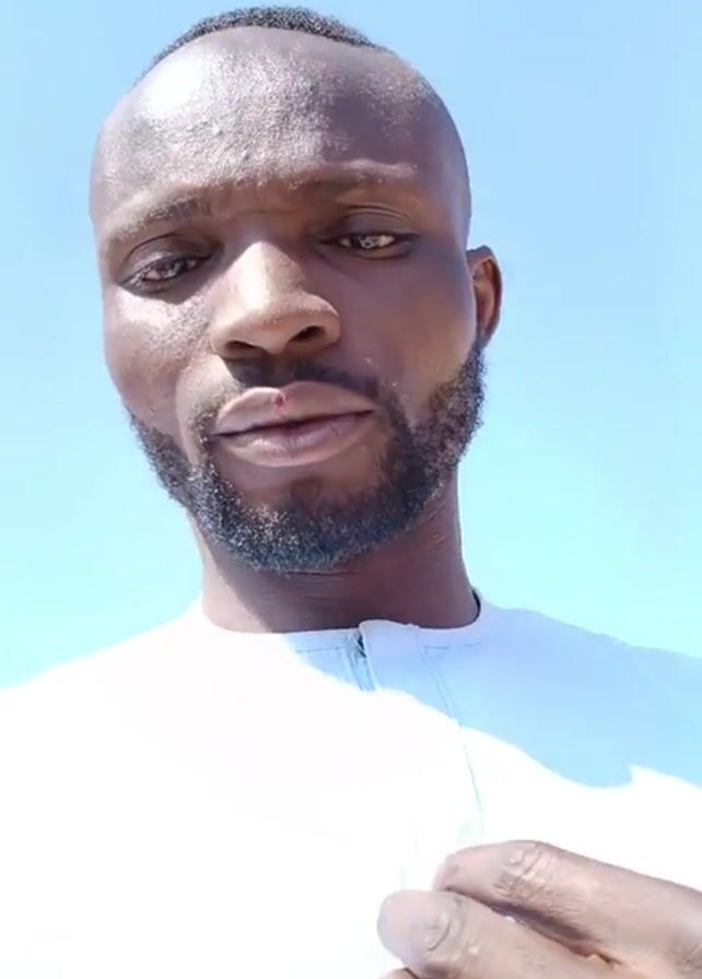 A medium-close up shot shows a man with brown skin, a shaved head, and a well-groomed beard, standing outside on a bright, sunny day. He is wearing a light blue shirt with a buttoned front. He looks directly at the camera with a serious expression. A small wound is visible on his upper lip. The background includes a clear blue sky, and faint outlines of buildings can be seen behind him. The man is touching his chest area with his right hand.