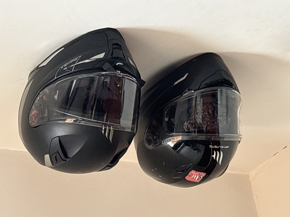 - "Two black full-face modular motorcycle helmets are depicted vertically against a light-colored, cream-colored interior wall" by FM-dYjX22, licensed under CC BY 4.0