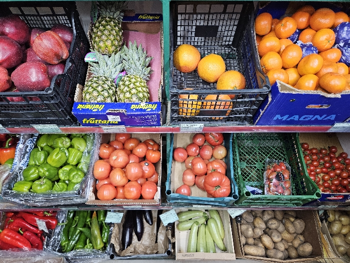 - "This image depicts a multi-tiered display of fresh produce within a retail environment, likely a grocery store or market, located in Varna, Bulgaria" by FM-l2gGi1, licensed under CC BY 4.0