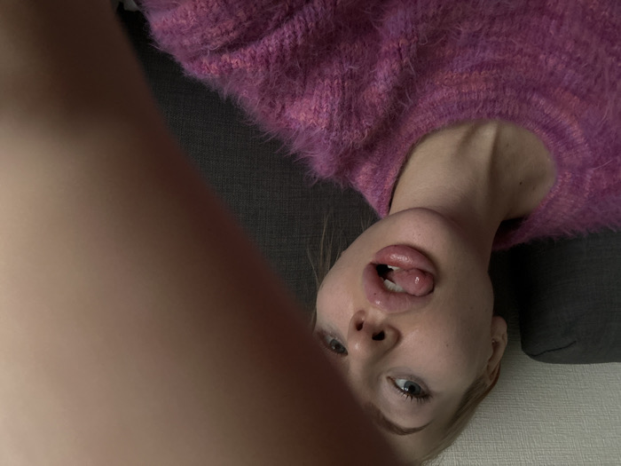 A young woman lies on a gray surface with her head tilted towards the camera, wearing a pink sweater. Her mouth is open, and her tongue is slightly protruding. Part of her left arm and hand are blurred in the left foreground. Her complexion is fair with blue eyes, and a portion of a white surface is visible at the bottom of the frame.